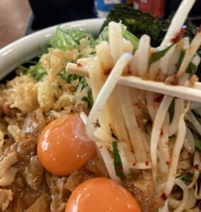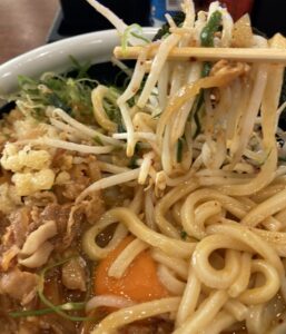 もやしにらが盛りだくさん。うどんの二郎インスパイア系というイメージか。