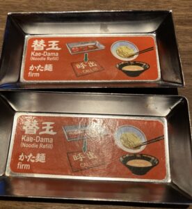店員さんが食券を回収し、替え玉プレートを置いて行ってくれます。(昔って固さの種類関係ないプレートだったきがしましたが、変わったのかな?)