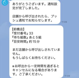 QRコード付きの整理券を渡され、ラインで登録。呼ばれる目安がわかるという時代を感じる便利なシステムでございます。